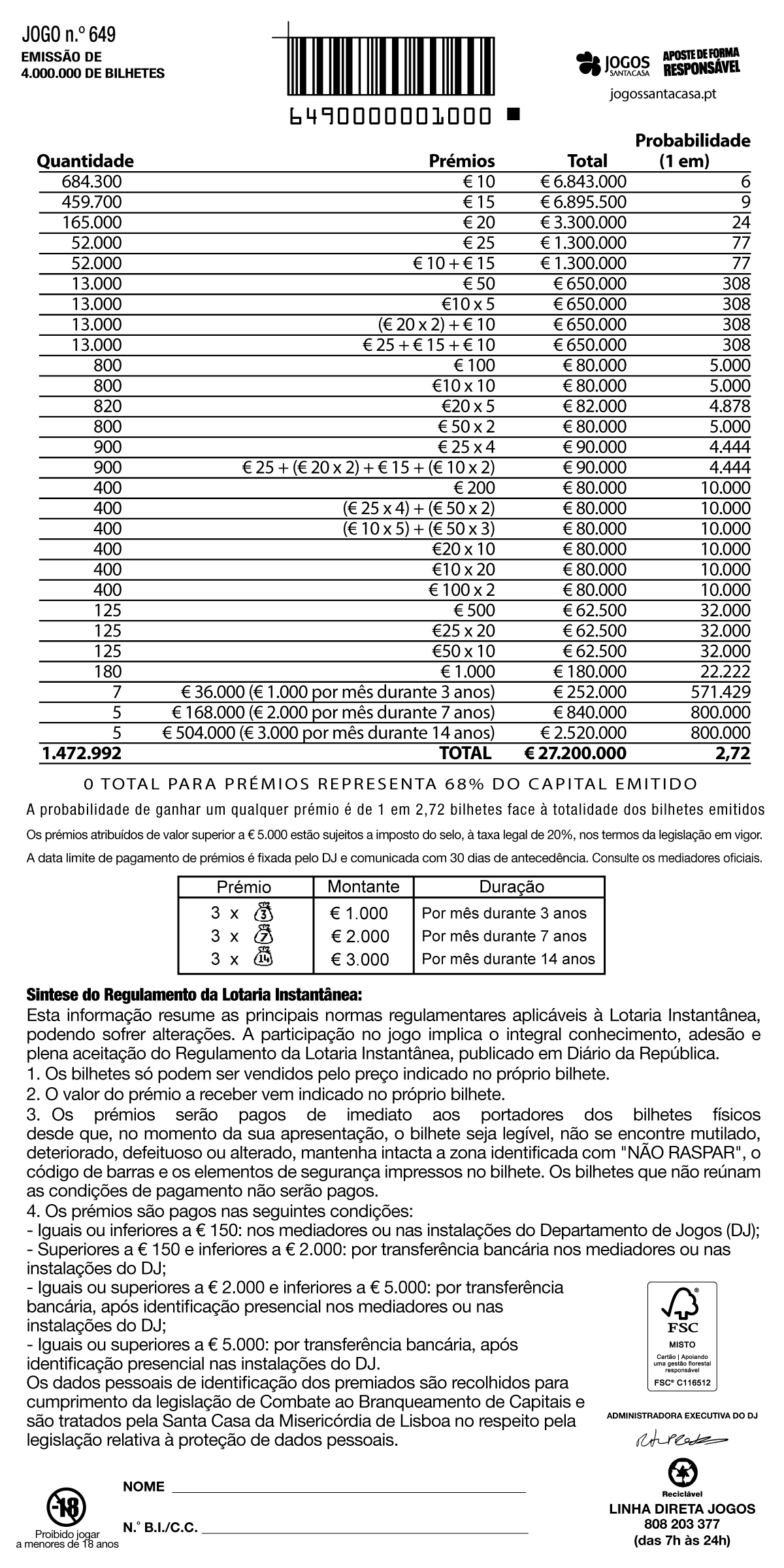 encontrar 3 “saco” com o mesmo número no seu interior, ganha, por mês, e pelo período de tempo indicado,